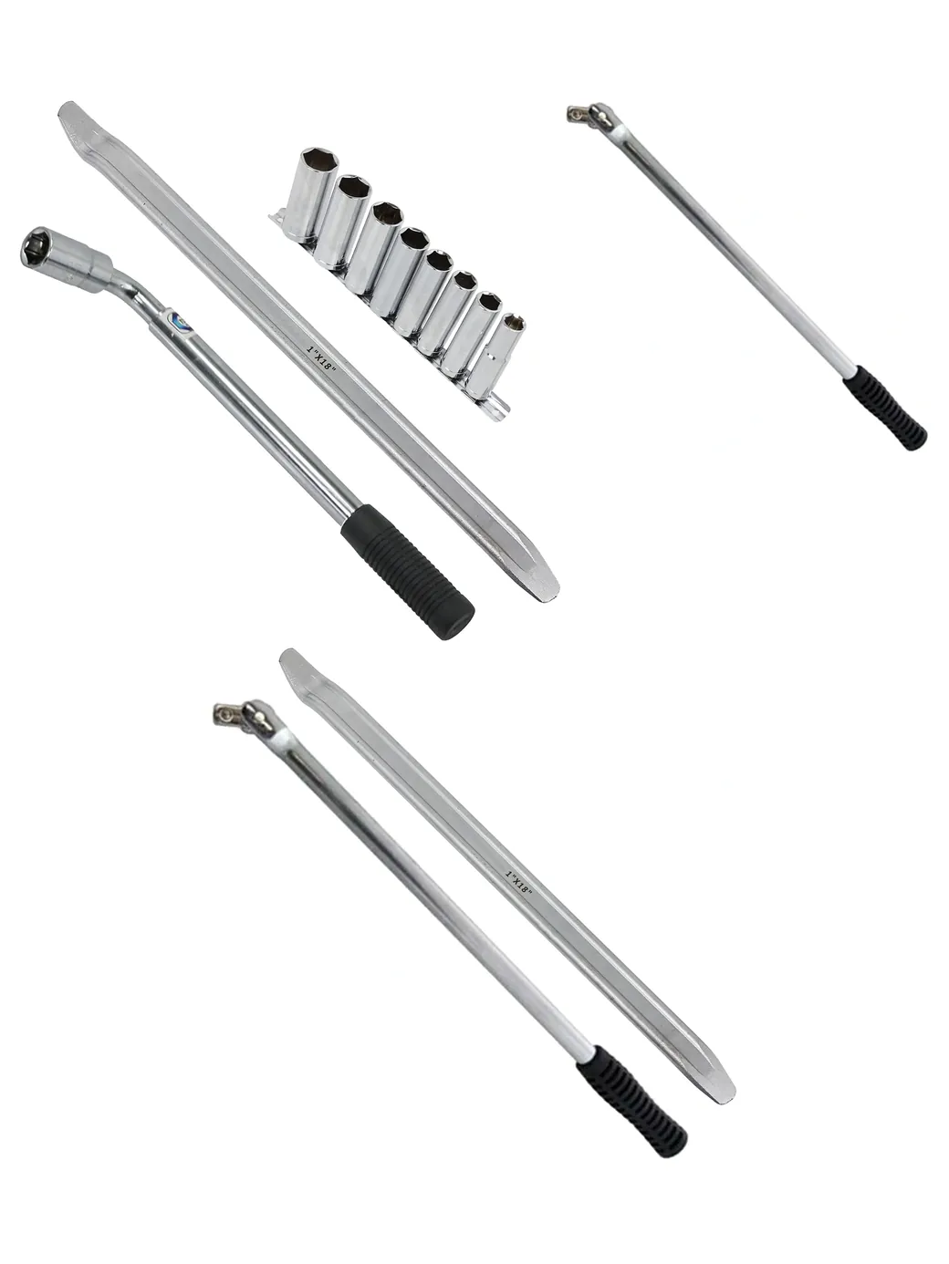 – Tyre iron – Drop‑forged steel, galvanized finish, 18″ long with a chunky 1″ width. One flat end and one curled end give maximum leverage for loosening or tightening lug nuts.