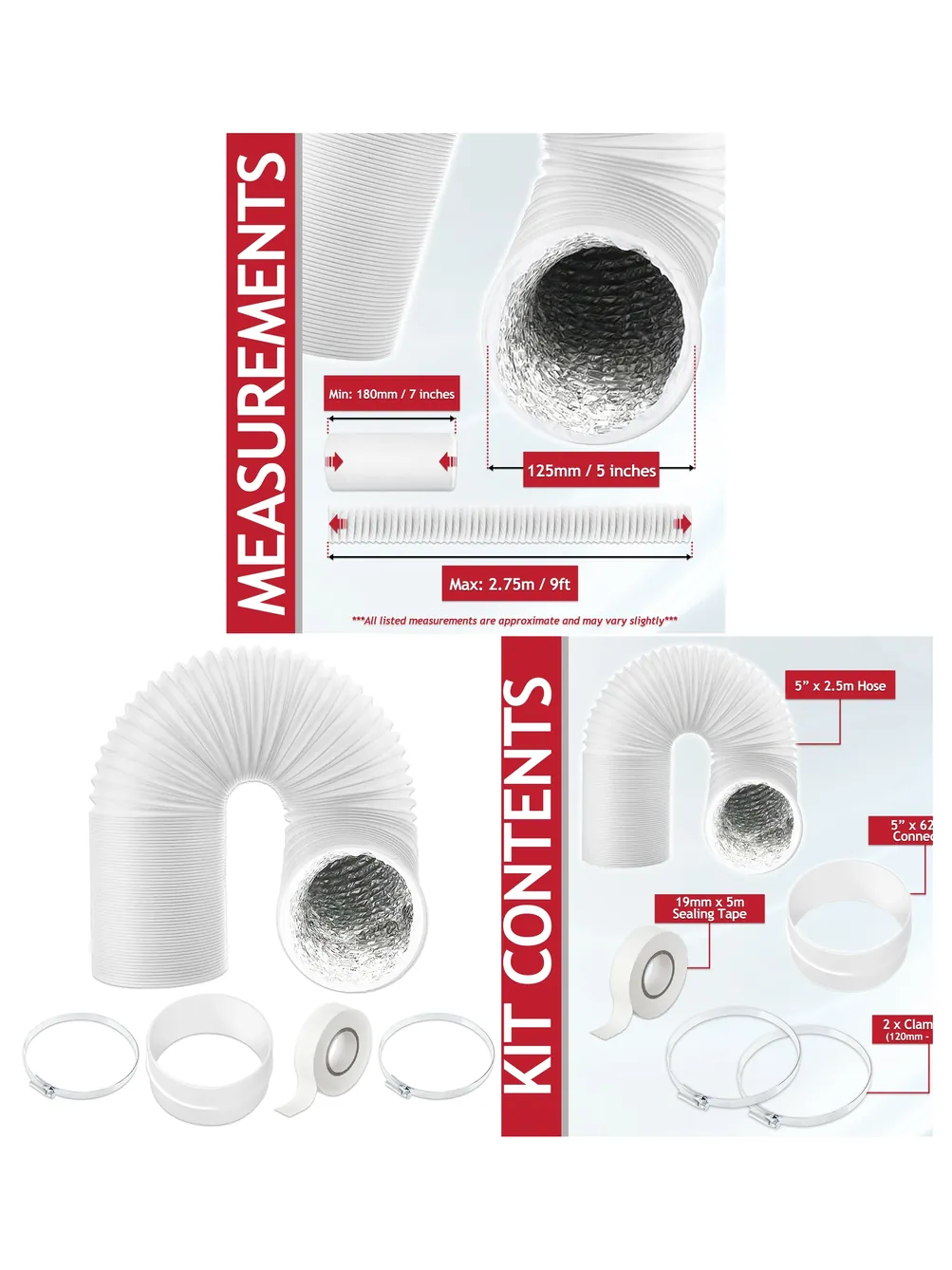 A 5‑inch, 2.5 m insulated PVC vent hose designed for range‑hood and extractor installations. The kit includes everything you need for a clean, airtight connection: a 125 mm (5″) insulated duct, a matching connector/extension ring, a 5 m roll of sealing tape, and two adjustable stainless‑steel clamp clips (120‑140 mm).