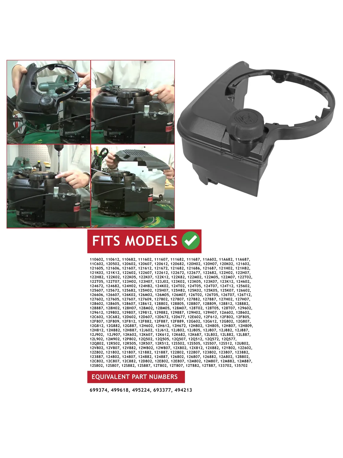 Works with most Briggs & Stratton Quantum series engines, including 110600, 111600, 11A600, 11C600, 120500, 120600 and their numerous sub‑models (e.g., 110602, 111607, 120682, 121687, 122K12, 124T07, 125H82, 126T12, 127887, 128M07, 129882, 133702 and many more). If your engine’s model number appears in the Quantum family list, this tank will fit.